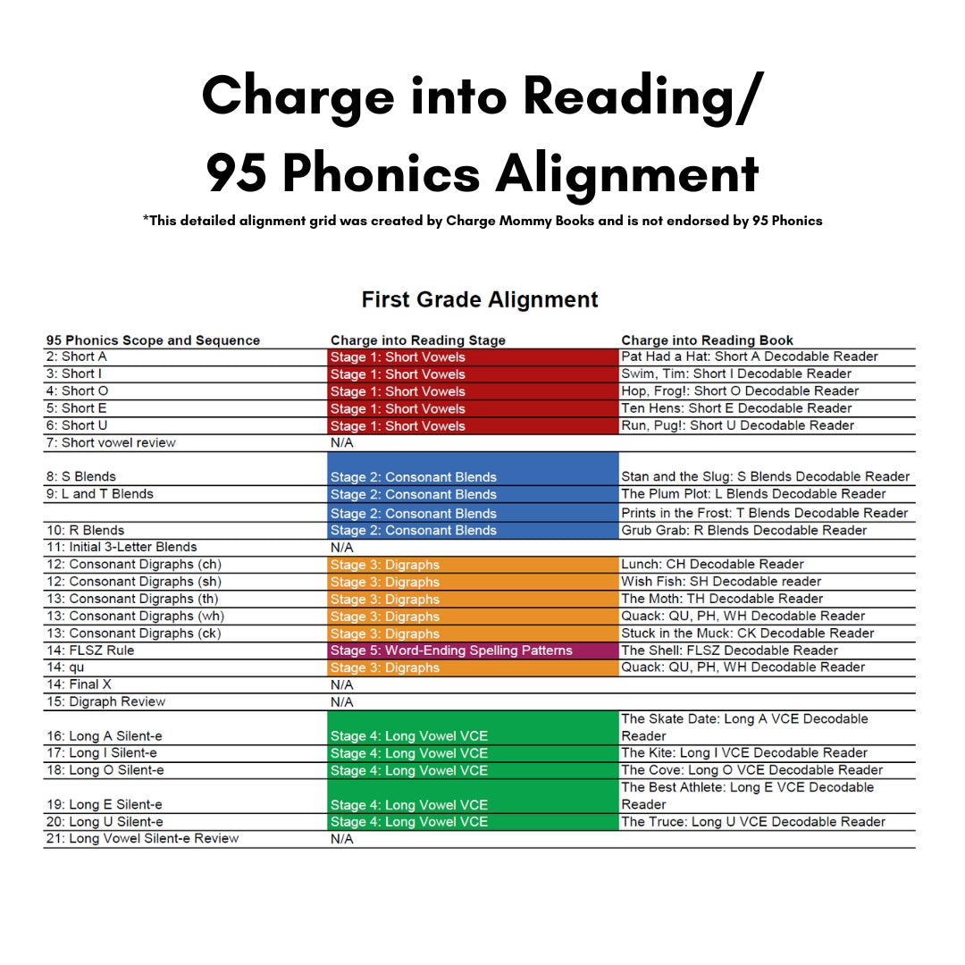 Our 95 Phonics curriculum alignment offers a complete pairing of the Charge into Reading books to the 95 Phonics Scope and Sequence, divided by skills introduced in kindergarten, first grade, and second grade.