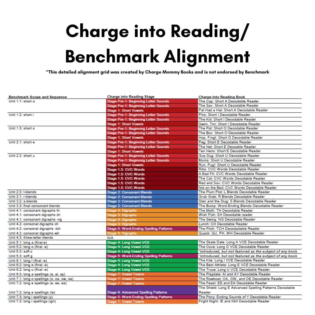 Our Benchmark curriculum alignment offers a complete pairing of the Charge into Reading books to the Benchmark Scope and Sequence, divided by skills introduced in kindergarten, first grade, and second grade.