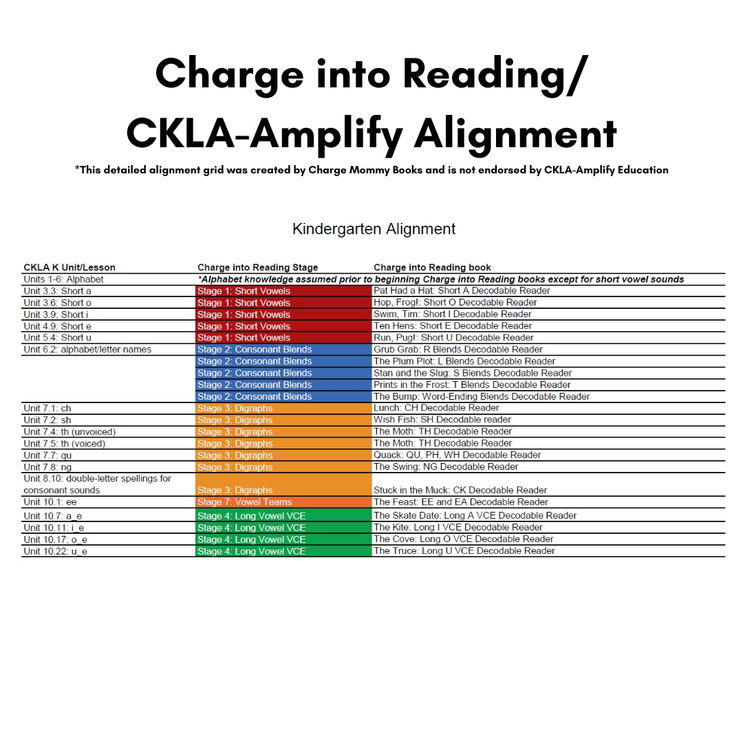 Our CKLA curriculum alignment offers a complete pairing of the Charge into Reading books to the CKLA Scope and Sequence, divided by skills introduced in kindergarten, first grade, and second grade.