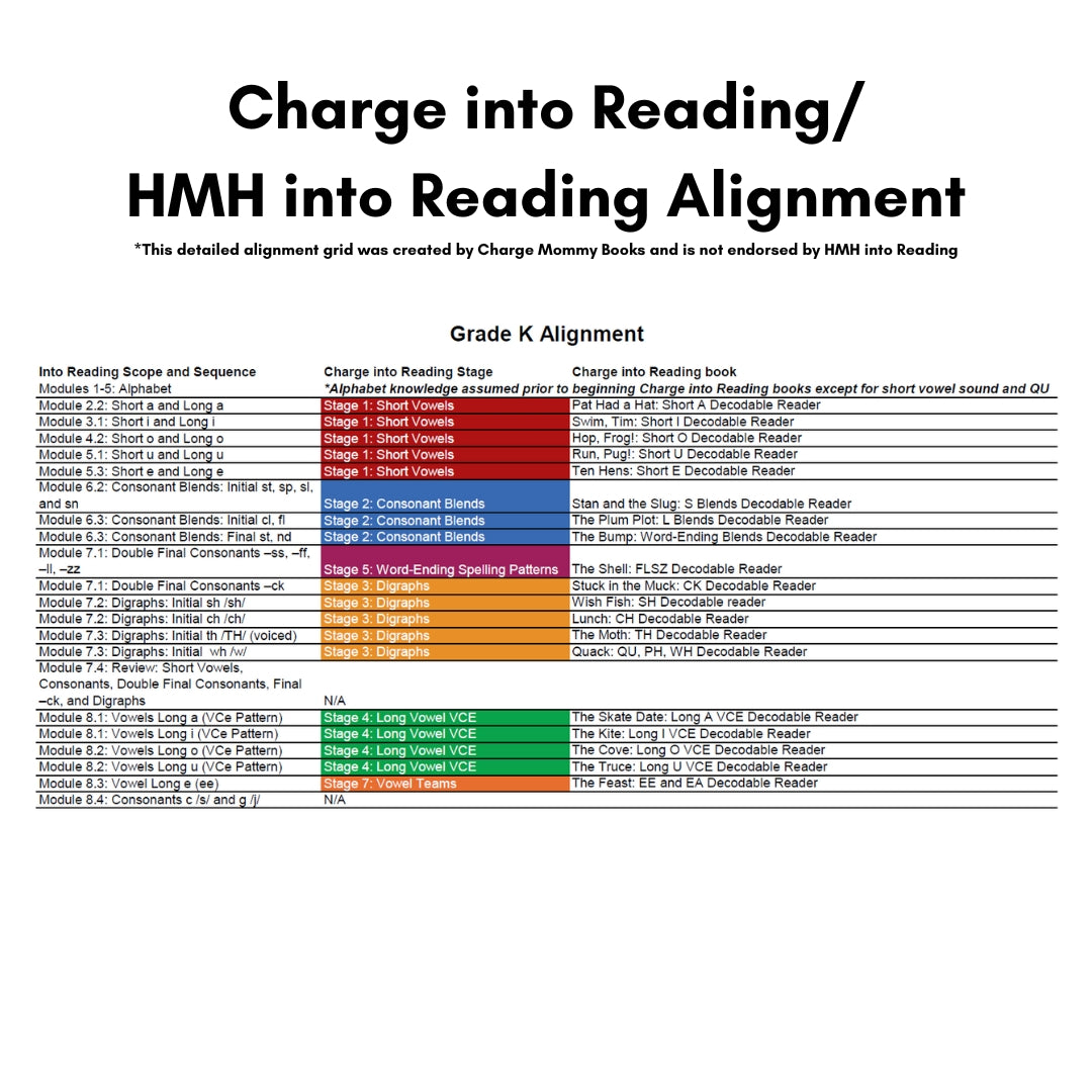 Our HMH into Reading curriculum alignment offers a complete pairing of the Charge into Reading books to each module of the HMH into Reading Scope and Sequence, divided by skills introduced in kindergarten, first grade, and second grade.