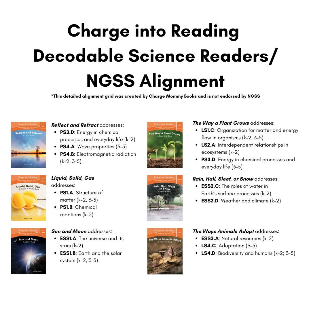 Our NGSS alignment breaks out each NGSS topic the Charge into Reading Decodable Science Readers cover by book and grade.