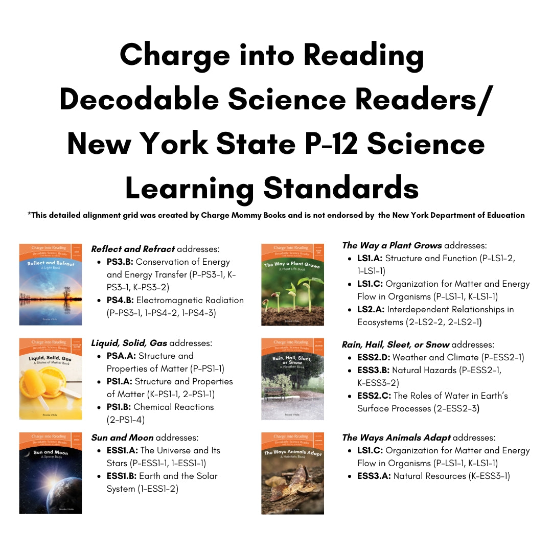 Our NY P-12 Science Standards alignment breaks out each topic the Charge into Reading Decodable Science Readers cover by book and grade.
