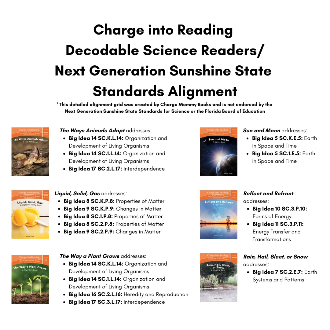 Our Next Generation Sunshine State Standards alignment breaks out each topic the Charge into Reading Decodable Science Readers cover by book and grade.