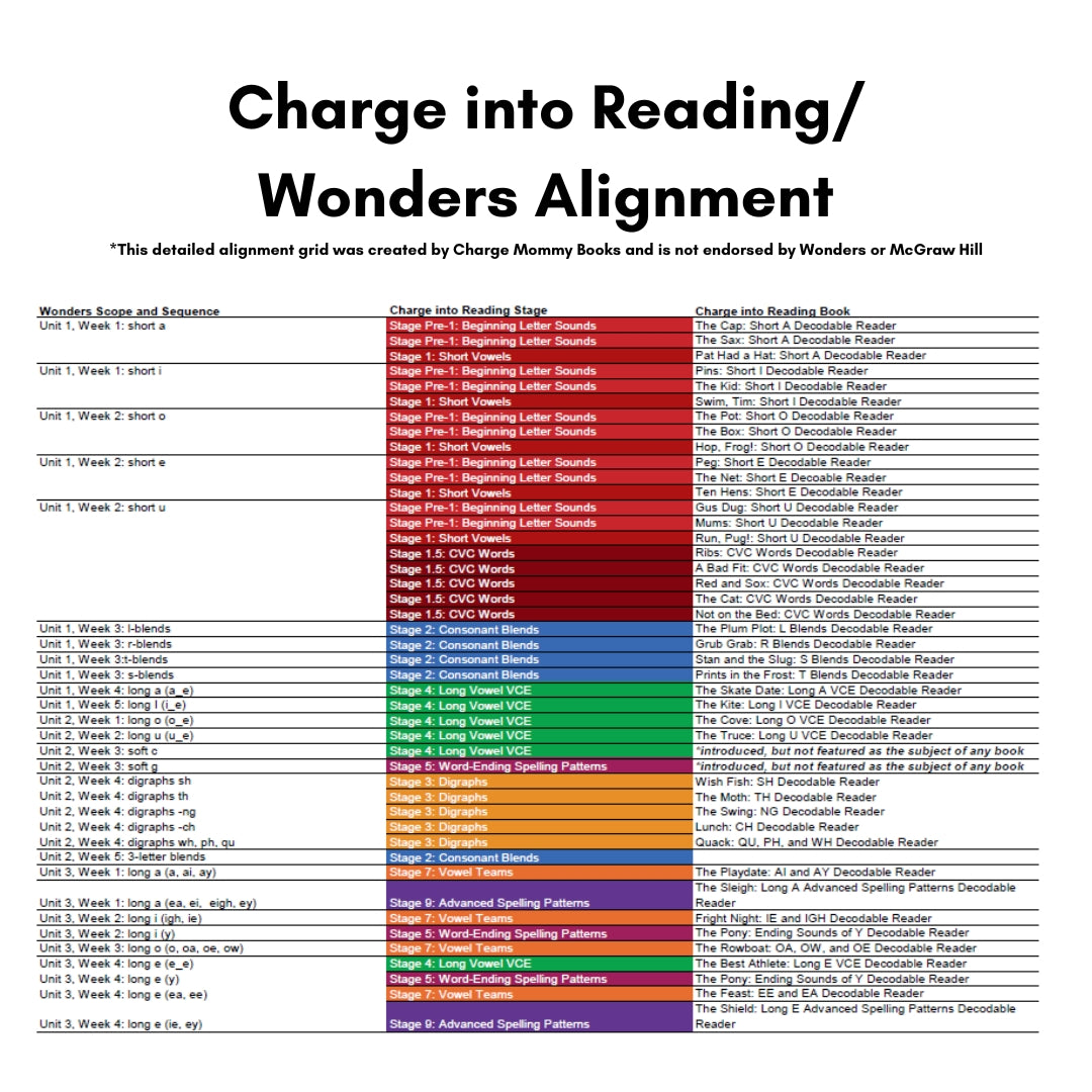 Our Wonders curriculum alignment offers a complete pairing of the Charge into Reading books to the Wonders Scope and Sequence, divided by skills introduced in kindergarten, first grade, and second grade.