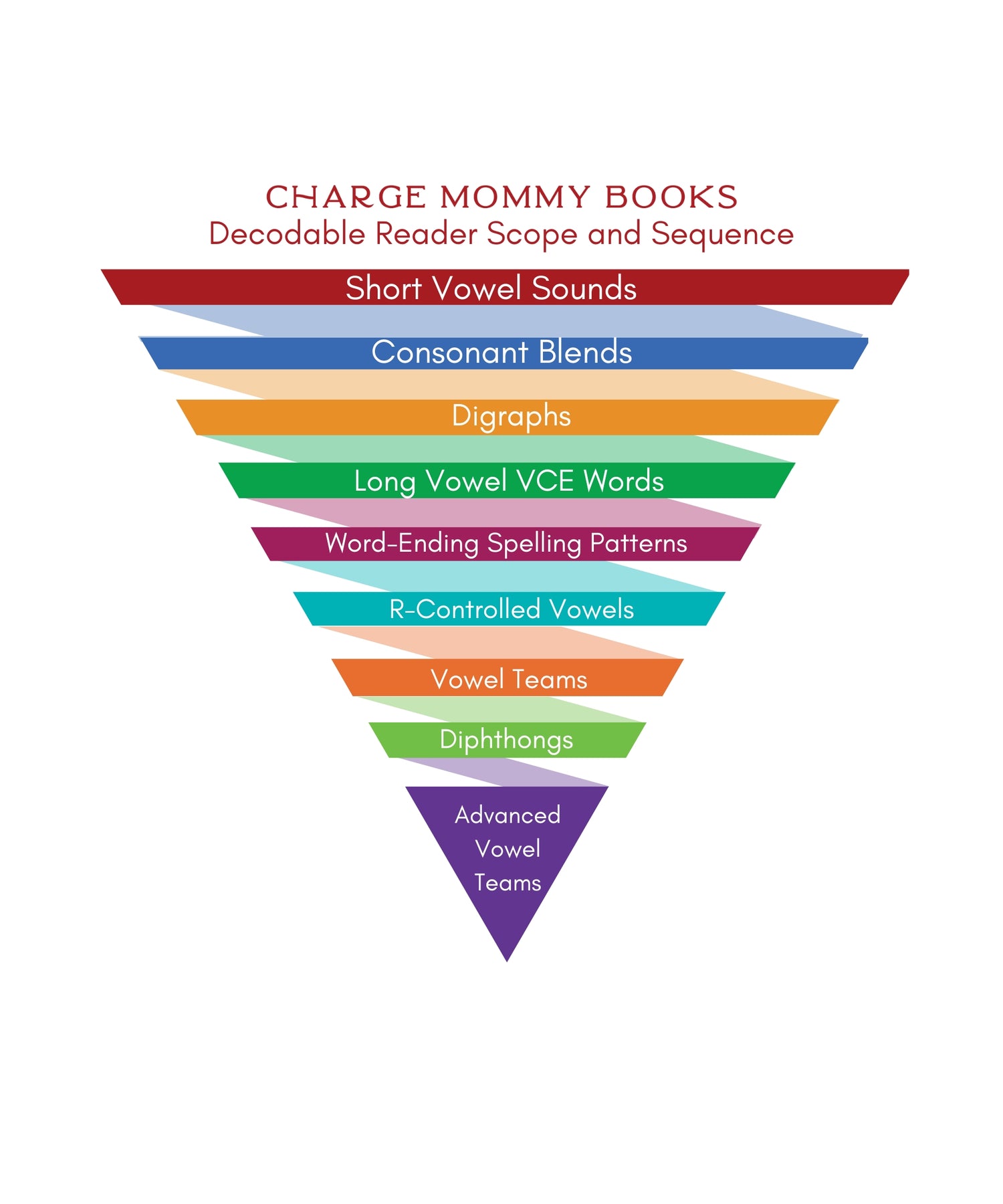The full scope and sequence is available for download and lists not only every book in the Charge into Reading collection but the graphemes and phonemes introduced in each book, as well as every word in every book.