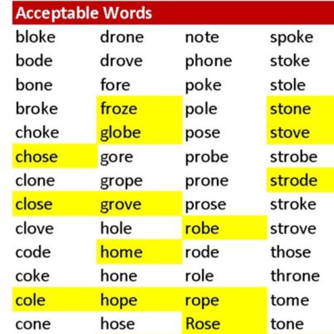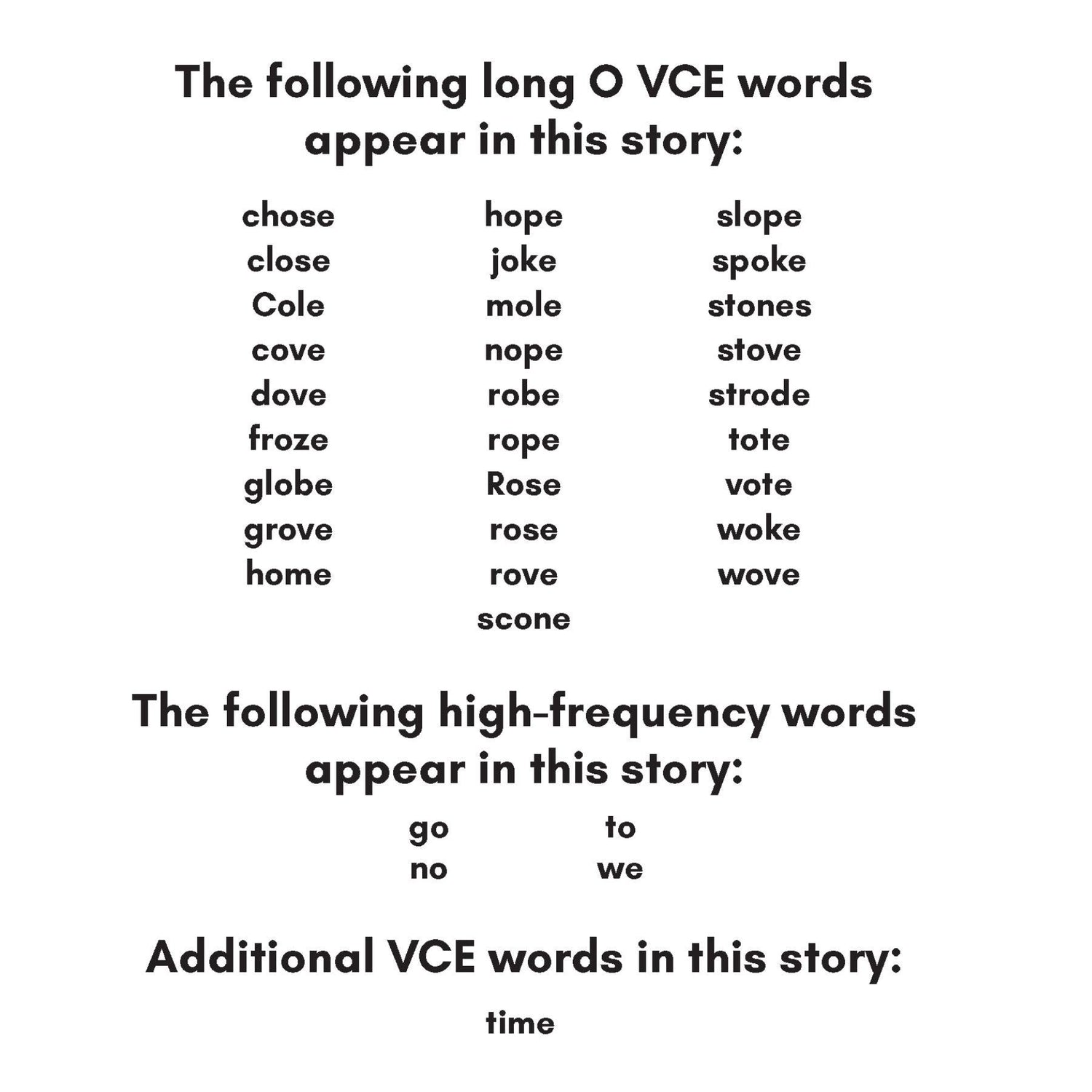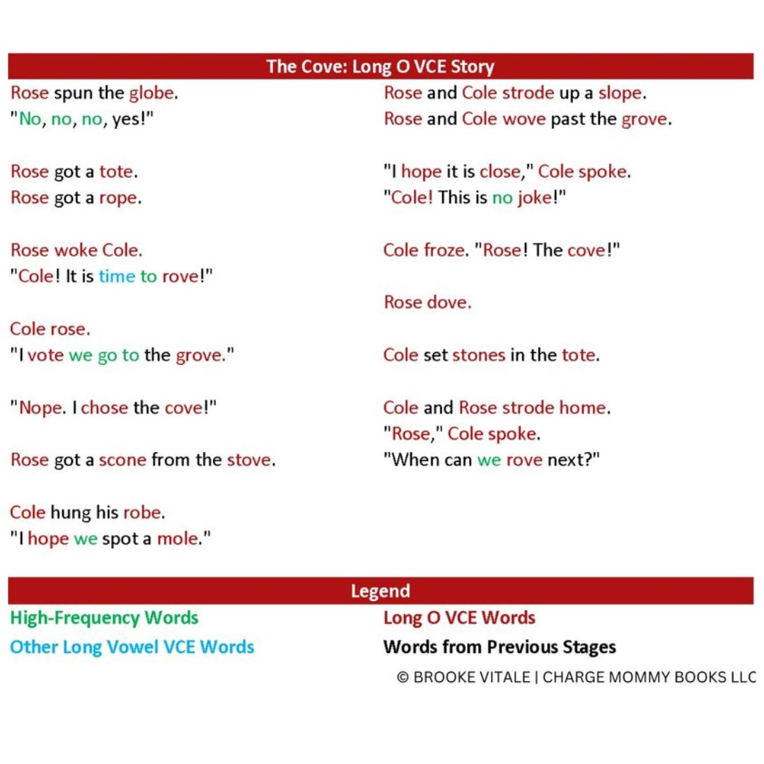 Each book in the Charge into Reading Decodable Reading System begins by finding acceptable words within the book's spelling pattern. Here is an example of the acceptable words within the Long O VCE spelling pattern.