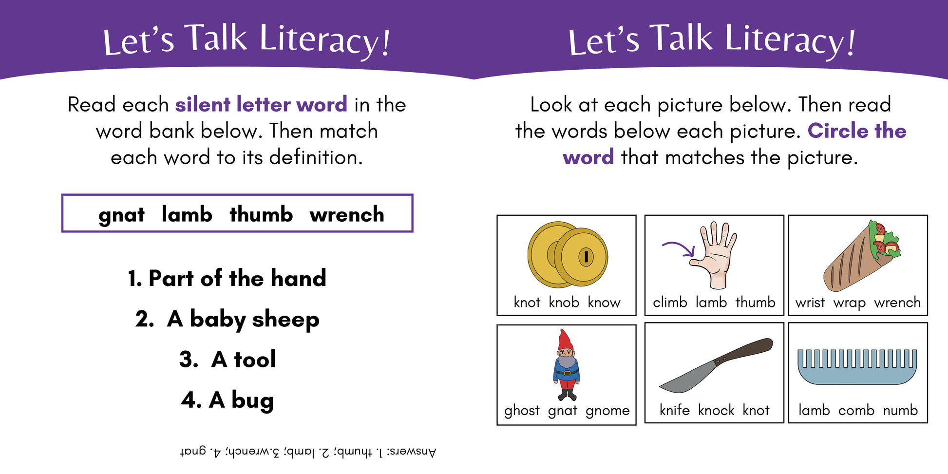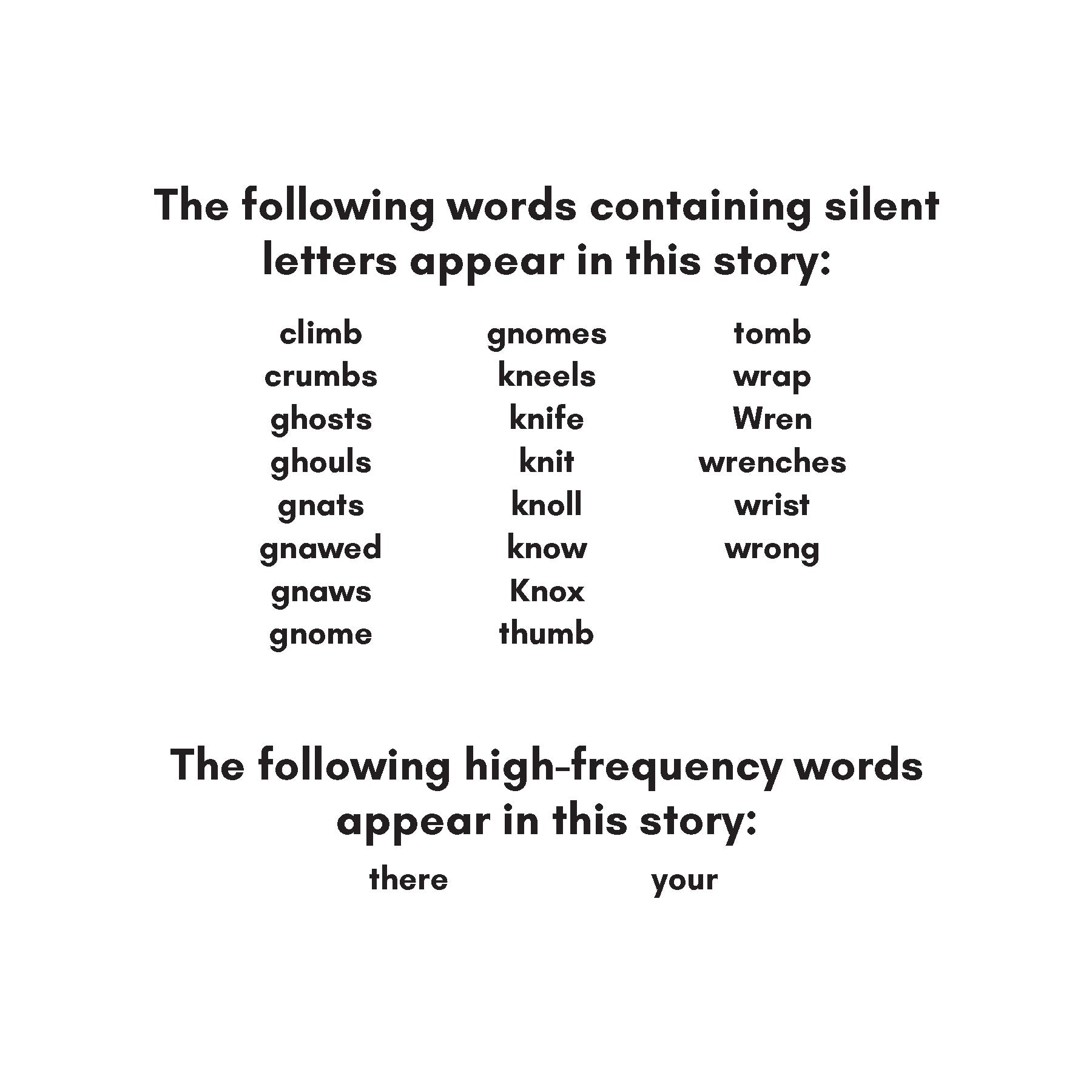 Silent letter words in this story: climb, crumbs, ghosts, ghouls, gnats, gnawed, gnaws, gnome, gnomes, kneels, knife, knit, knoll, know, Knox, thumb, tomb, wrap, Wren, wrenches, wrist, wrong