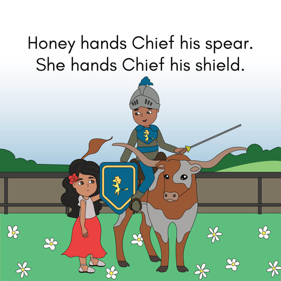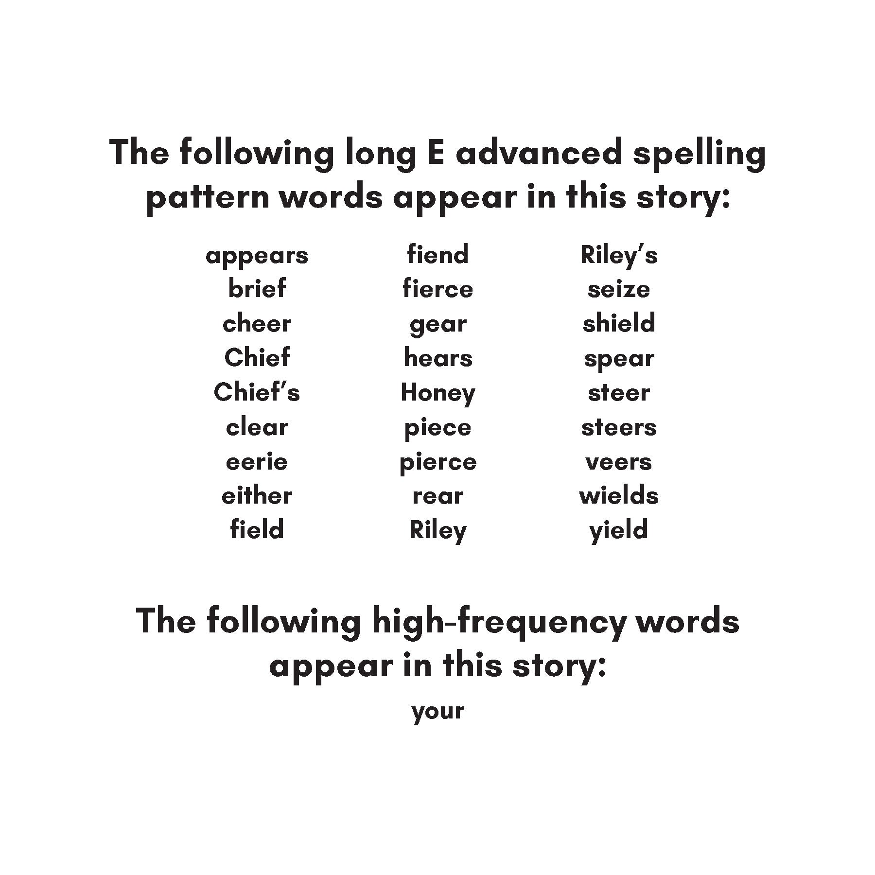Long E advanced spelling pattern words in this story: appears, brief, cheer, Chief, Chief’s, clear, eerie, either, field, fiend, fierce, gear, hears, Honey, piece, pierce, rear, Riley, Riley’s, seize, shield, spear, steer, steers, veers, wields, yield