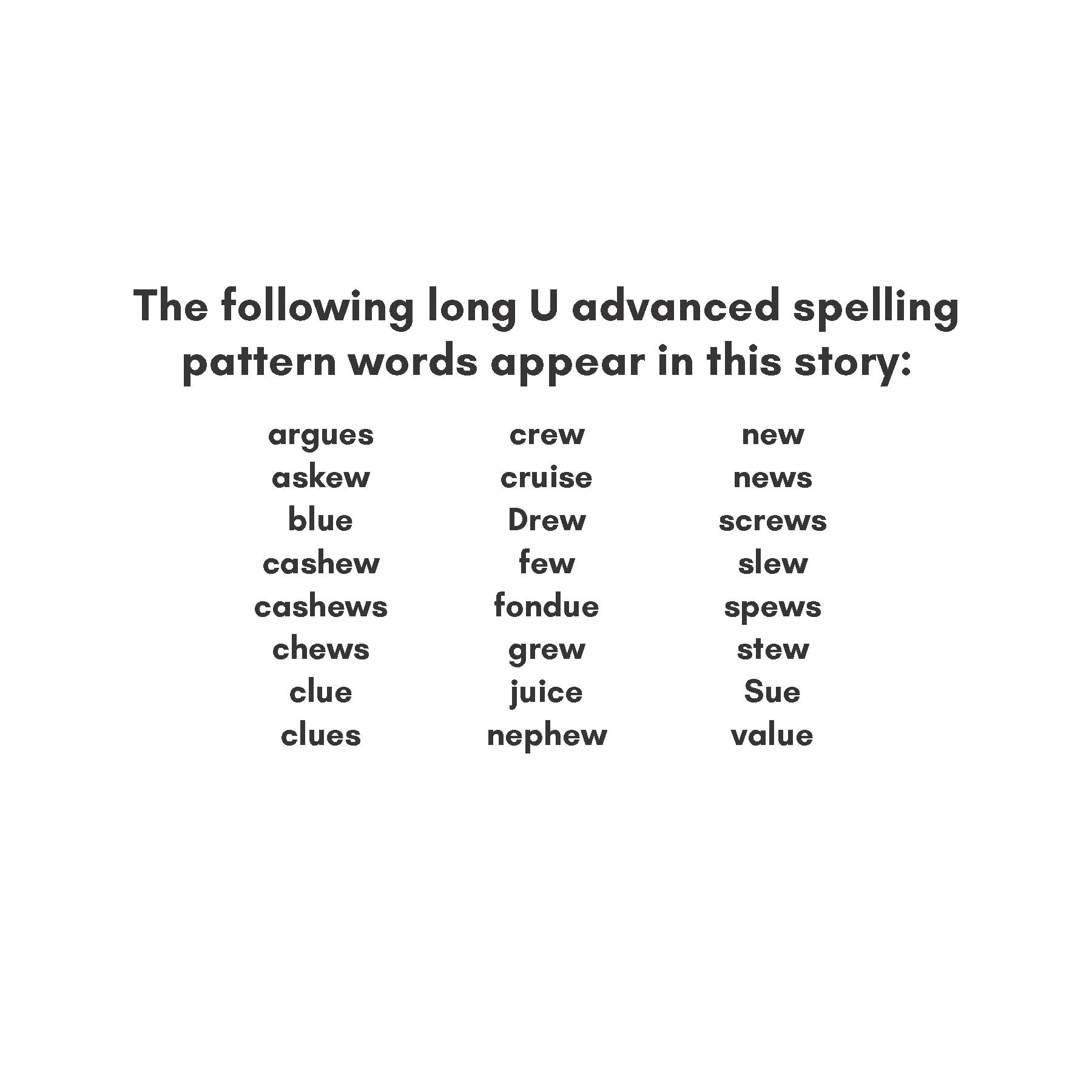 Long U advanced spelling pattern words in this story: argues, askew, blue, cashew, cashews, chews, clue, clues, crew, cruise, Drew, few, fondue, grew, juice, nephew, new, news, screws, slew, spews, stew, Sue, value -