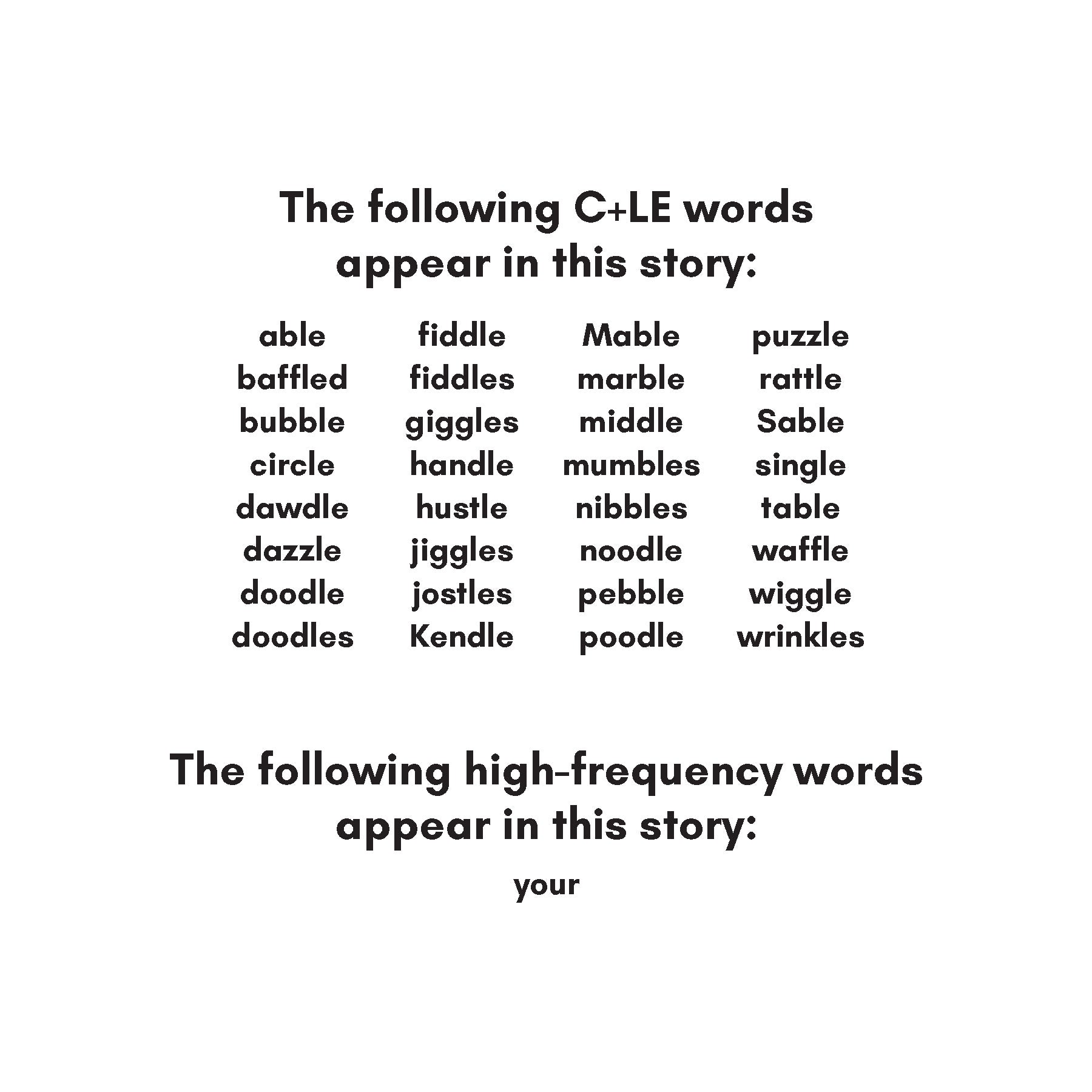 C+LE words in this story: able, baffled, bubble, circle, dawdle, dazzle, doodle, doodles, fiddle, fiddles, giggles, handle, hustle, jiggles, jostles, Kendle, Mable, marble, middle, mumbles, nibbles, noodle, pebble, poodle, puzzle, rattle, Sable, single, table, waffle, wiggle, wrinkles