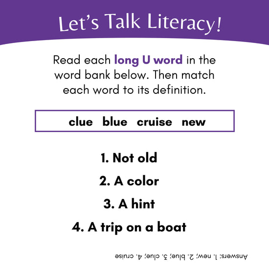 Part of reading fluently is understanding the words on the page. Test your child's understanding and vocabulary by asking them to match each word to its proper definition.
