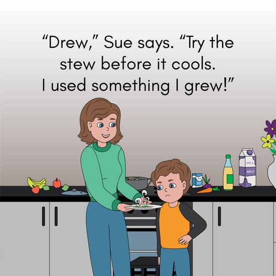 Aunt Sue made dinner for Drew: stew. But she made it with something she grew. Can Drew use her clues to solve the mystery?