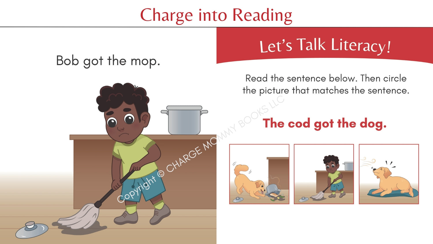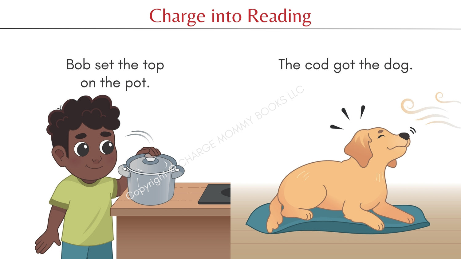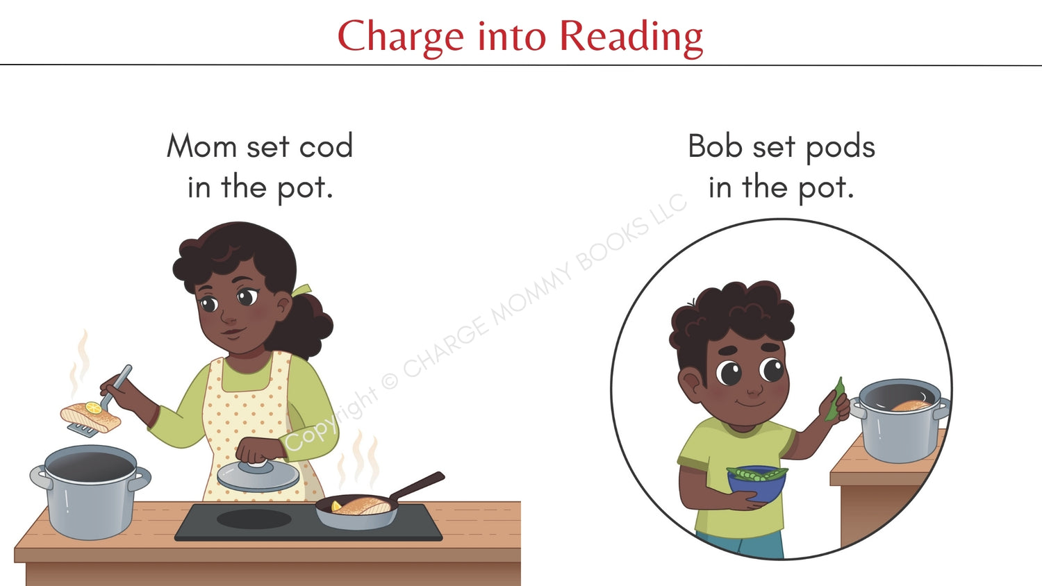Short O Words in this story: Bob, cod, dog, got, Mom, mop, on, pods, pot, top