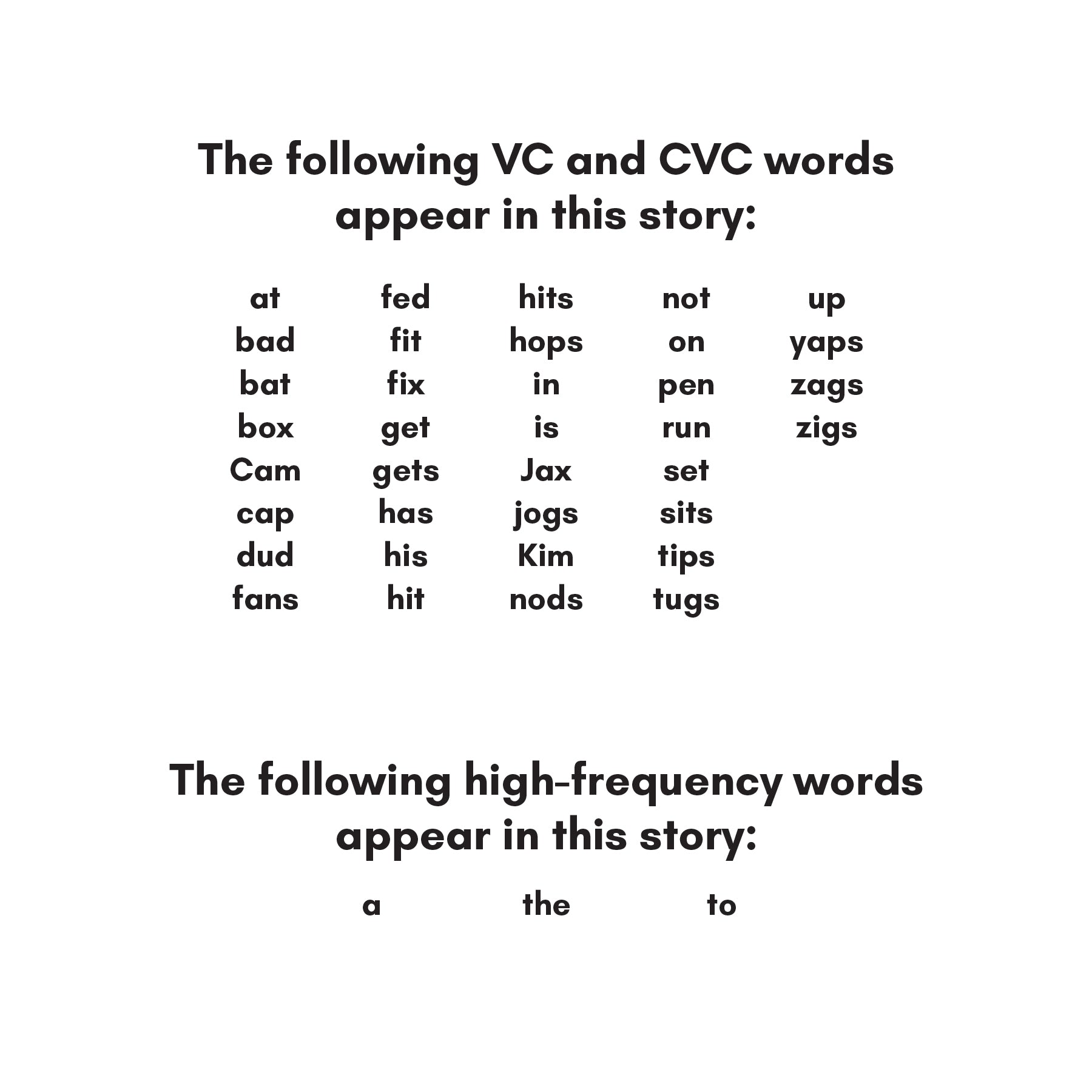 CVC words in this story:at, bad, bat, box, Cam, cap, dud, fans, fed, fit, fix, get, gets, has, his, hit, hits, hops, in, is, Jax, jogs, Kim, nods, not, on, pen, run, set, sits, tips, tugs, up, yaps, zags, zigs