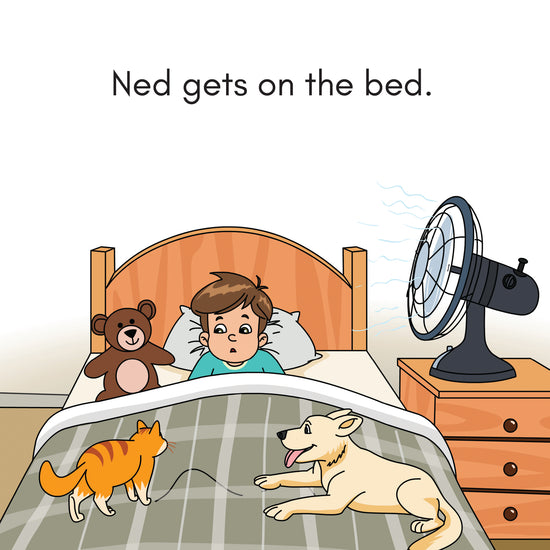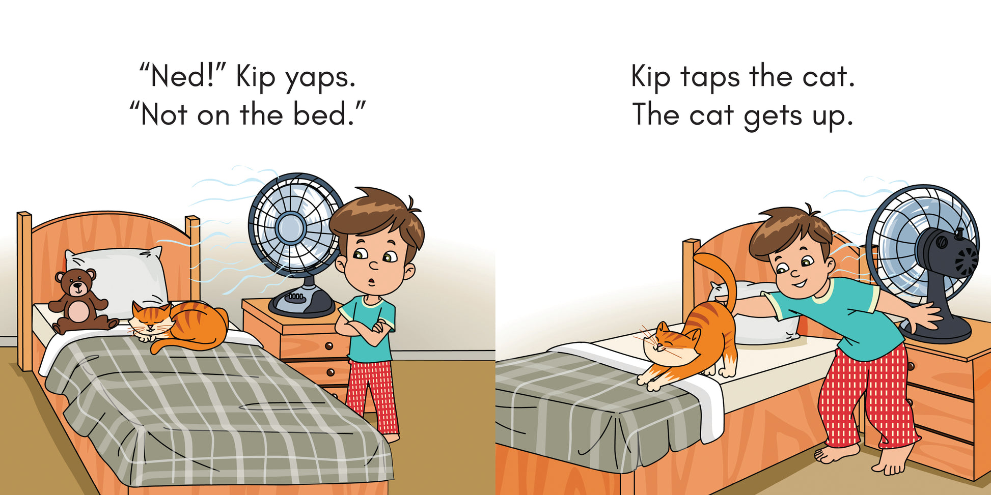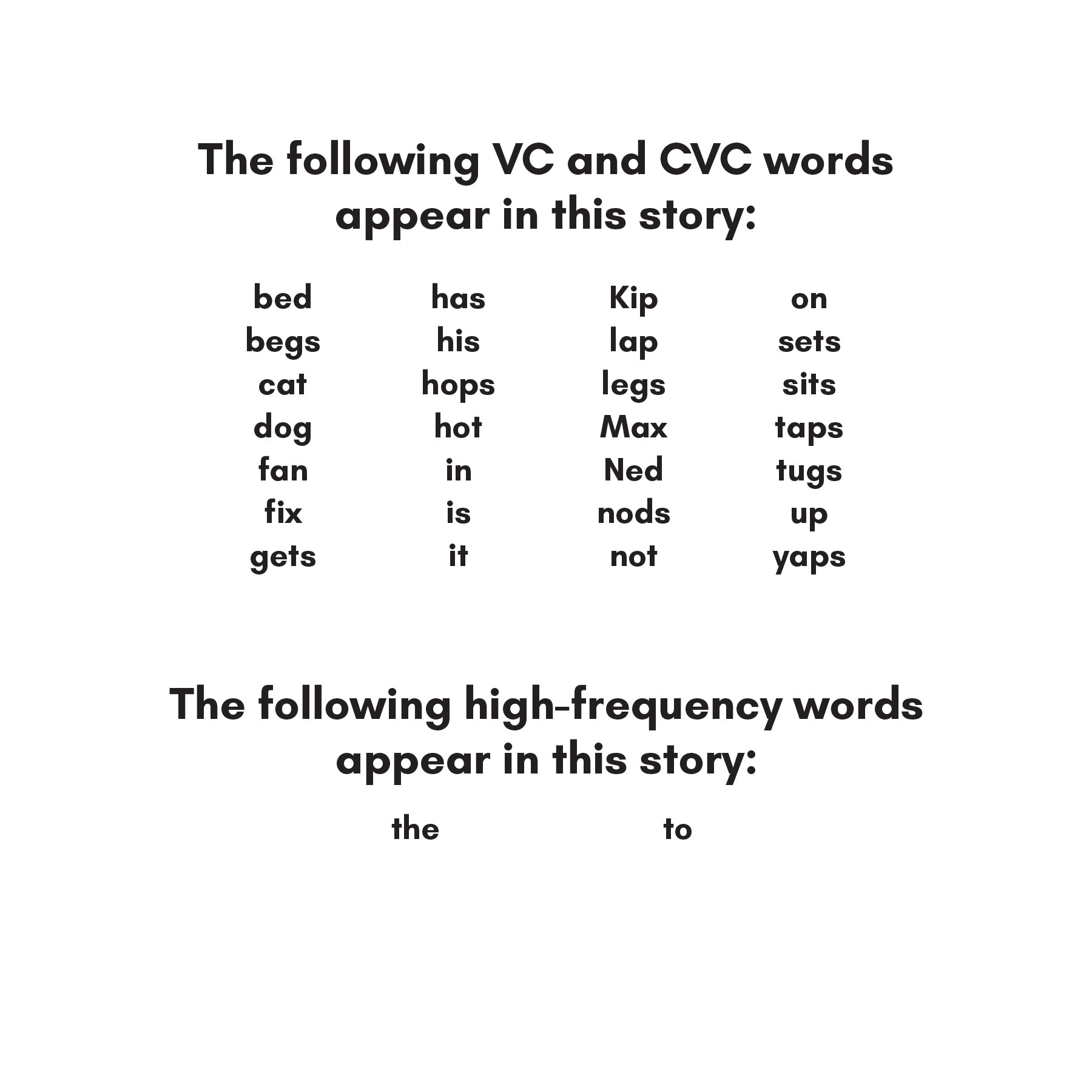 CVC words in this story: bed, begs, cat, dog, fan, fix, gets, has, his, hops, hot, in, is, it, Kip, lap, legs, Max, Ned, nods, not, on, sets, sits, taps, tugs, up, yaps