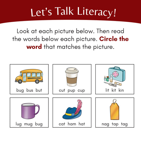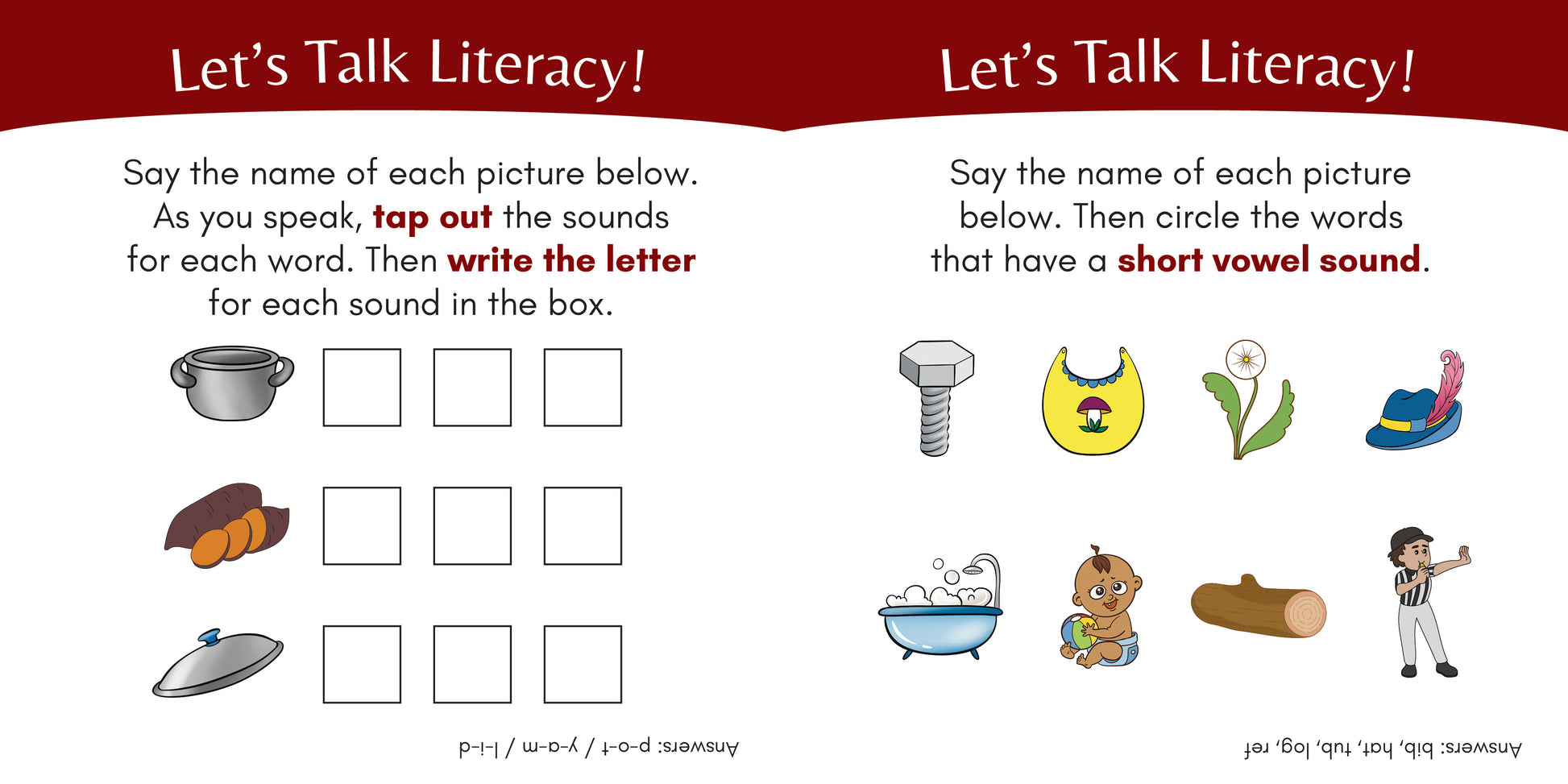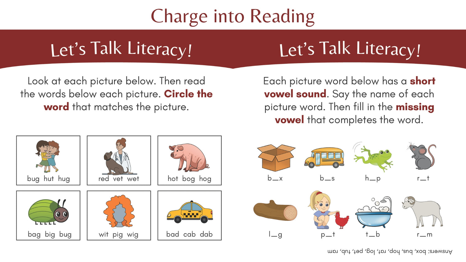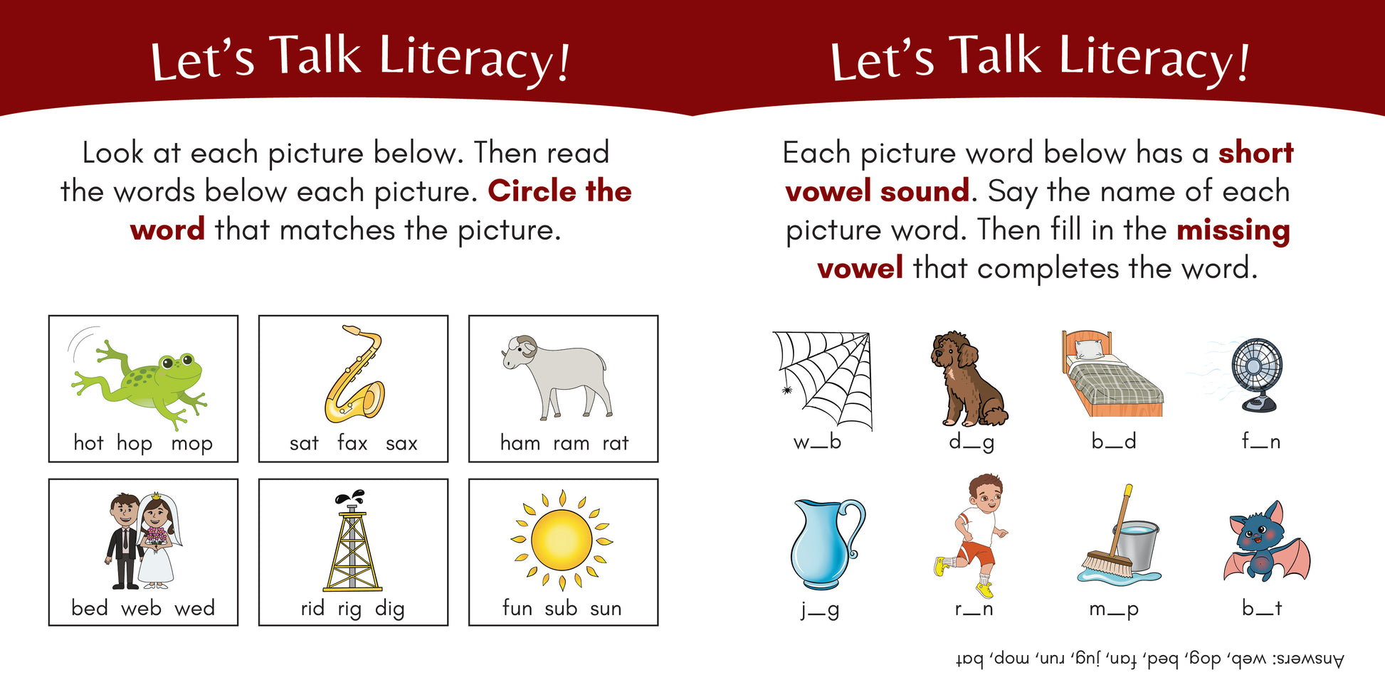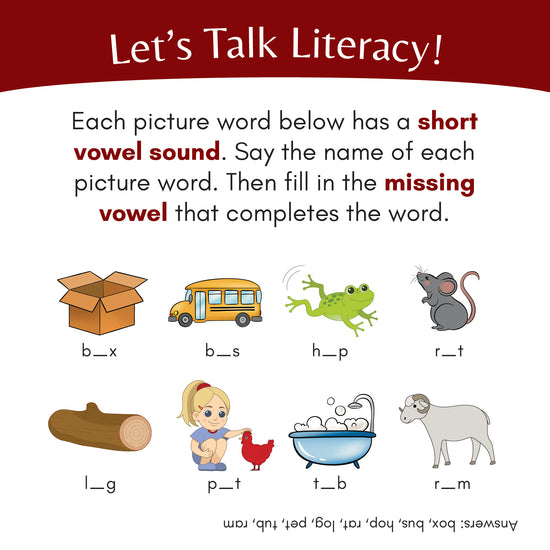 One of the earliest steps in reading is recognizing the sounds that go into a word. Work with your child to identify each picture word and determine the short vowel sound that would complete the word.
