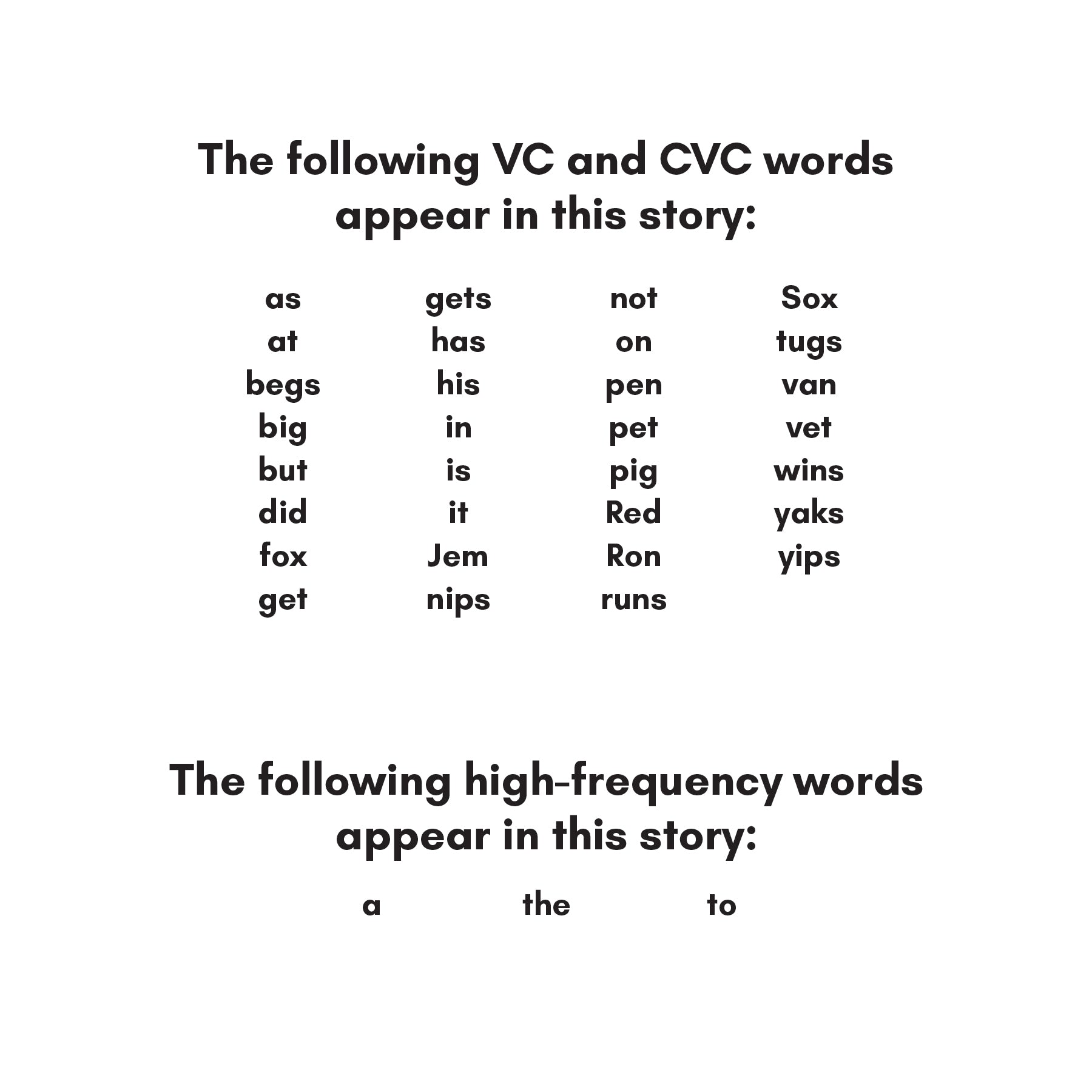CVC words in this story:as, at, begs, big, but, did, fox, get, gets, has, his, in, is, it, Jem, nips, not, on, pen, pet, pig, Red, Ron, runs, Sox, tugs, van, vet, wins, yaks, yips