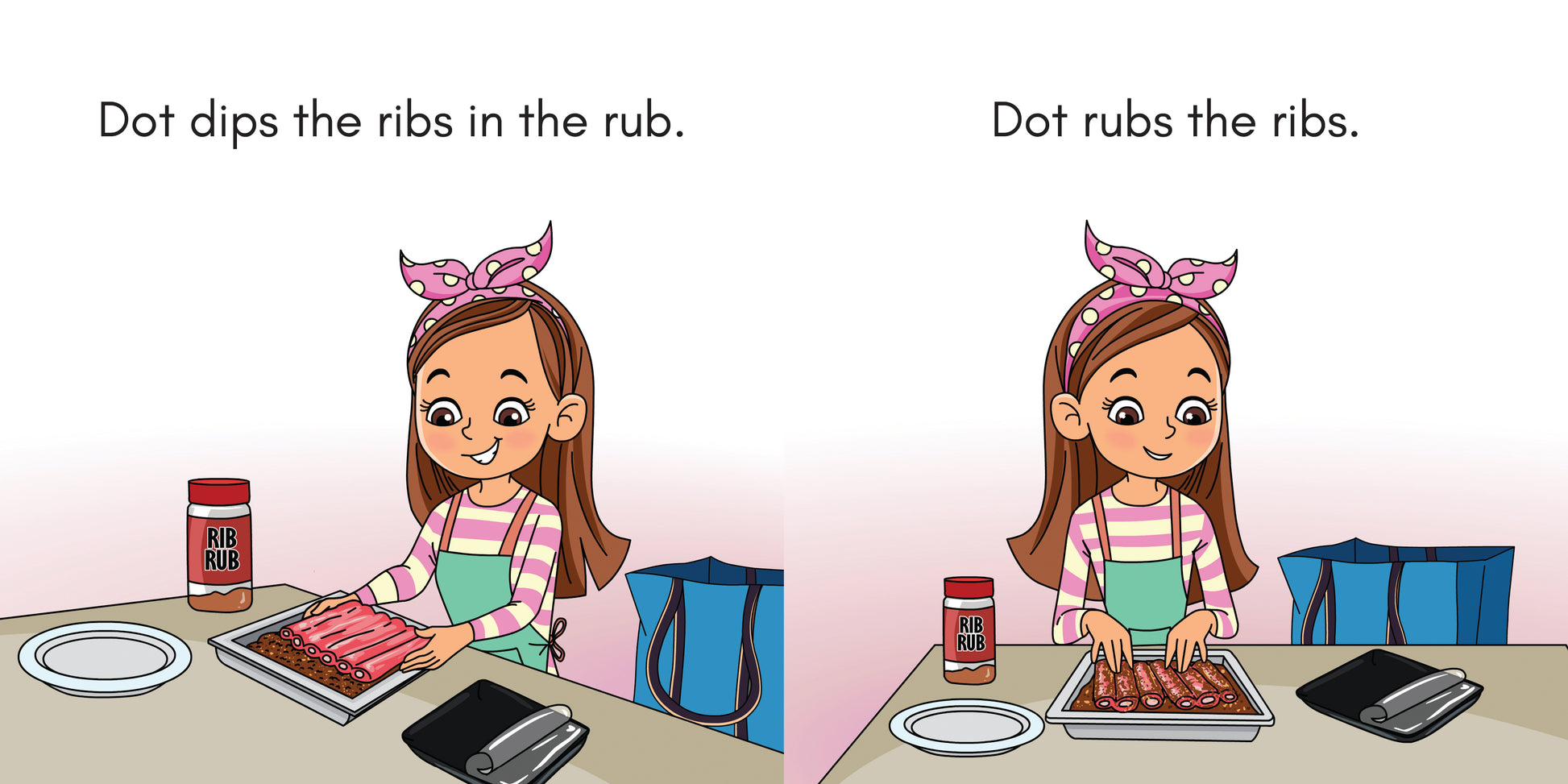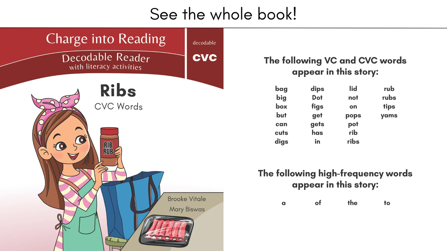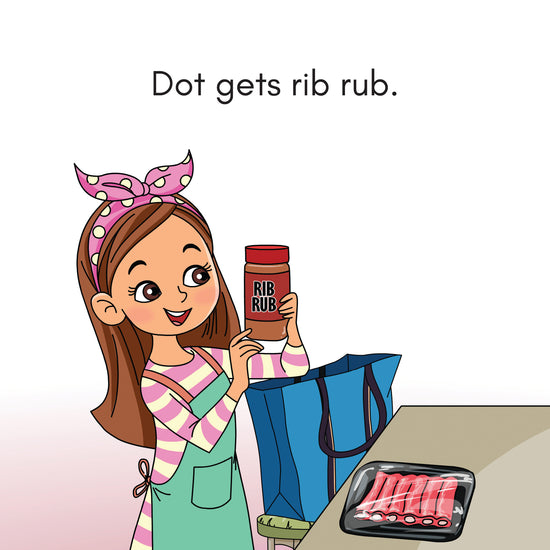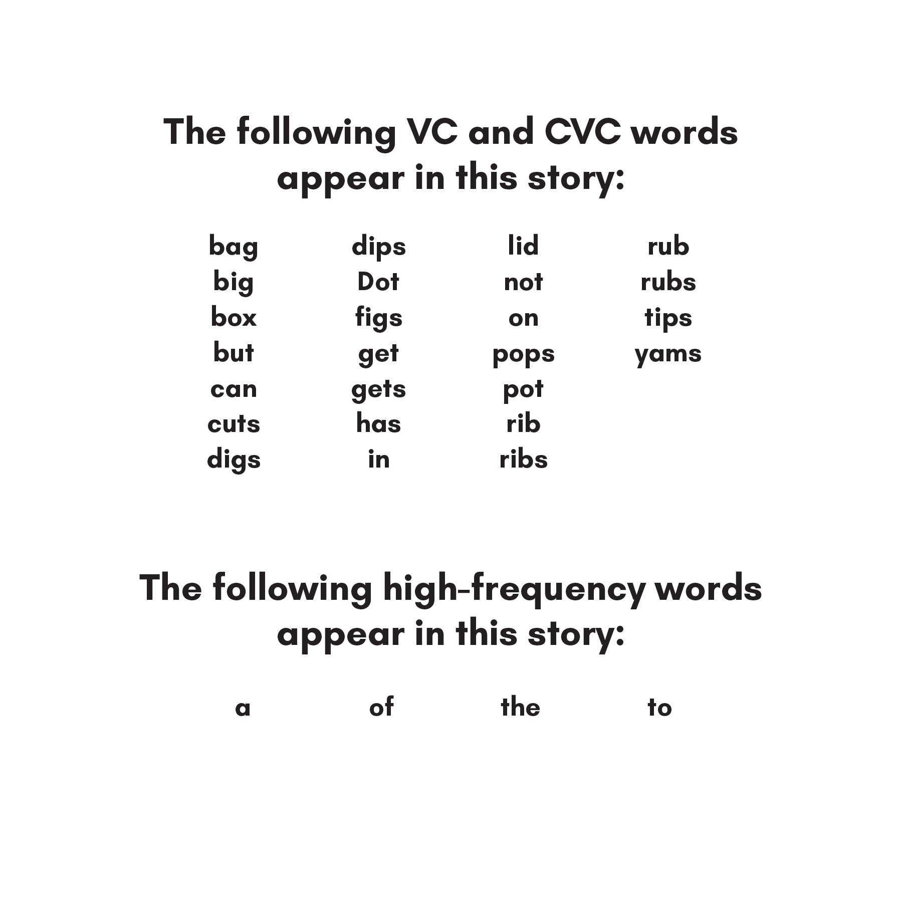 CVC words in this story:bag, big, box, but, can, cuts, digs, dips, Dot, figs, get, gets, has, in, lid, not, on, pops, pot, rib, ribs, rub, rubs, tips, yams