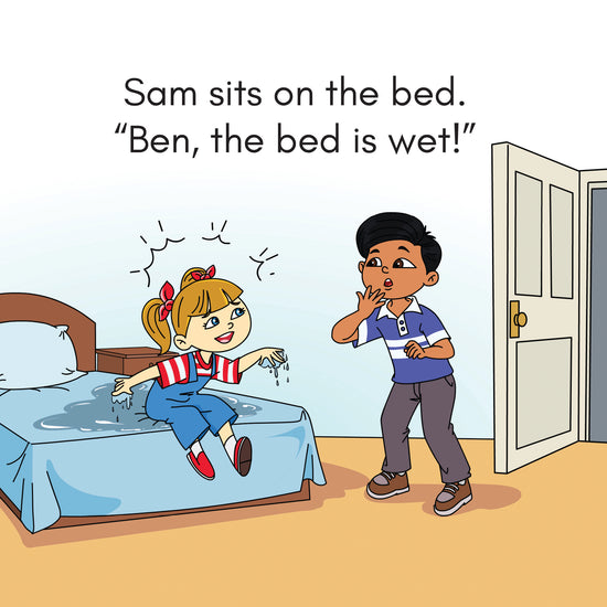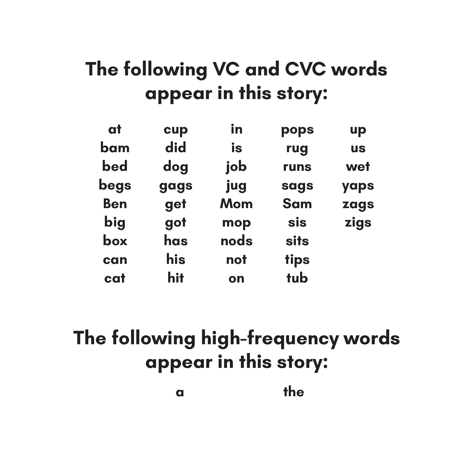 CVC Words in this story: at, bam, bed, begs, Ben, big, box, can, cat, cup, did, dog, gags, get, got, has, his, hit, in, is, job, jug, Mom, mop, nods, not, on, pops, rug, runs, sags, Sam, sis, sits, tips, tub, up, us, wet, yaps, zags, zigs