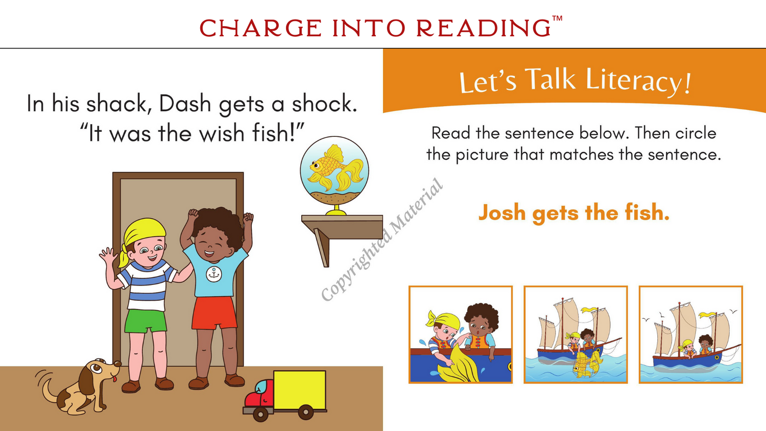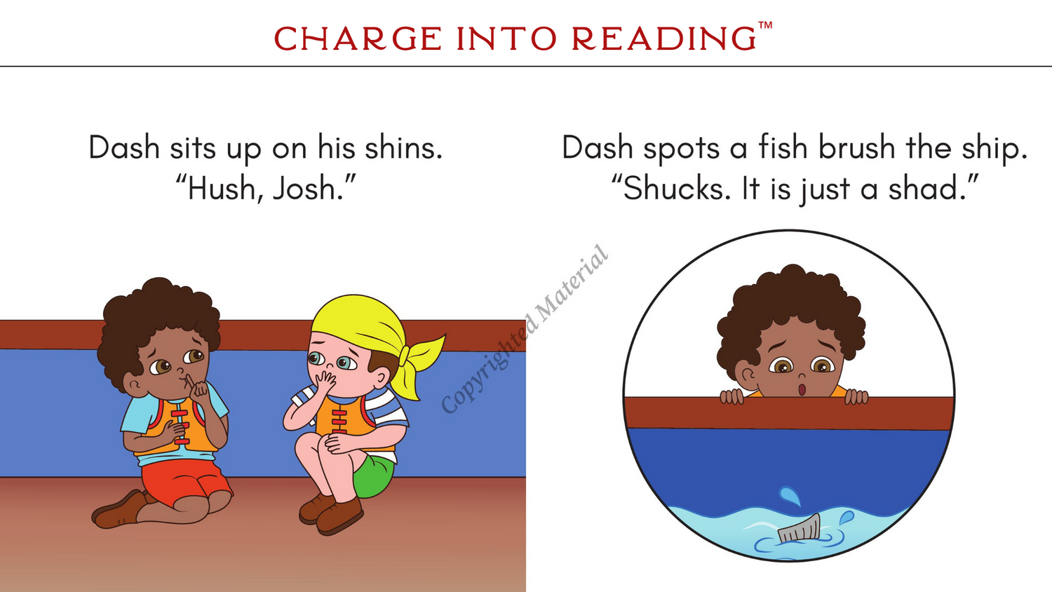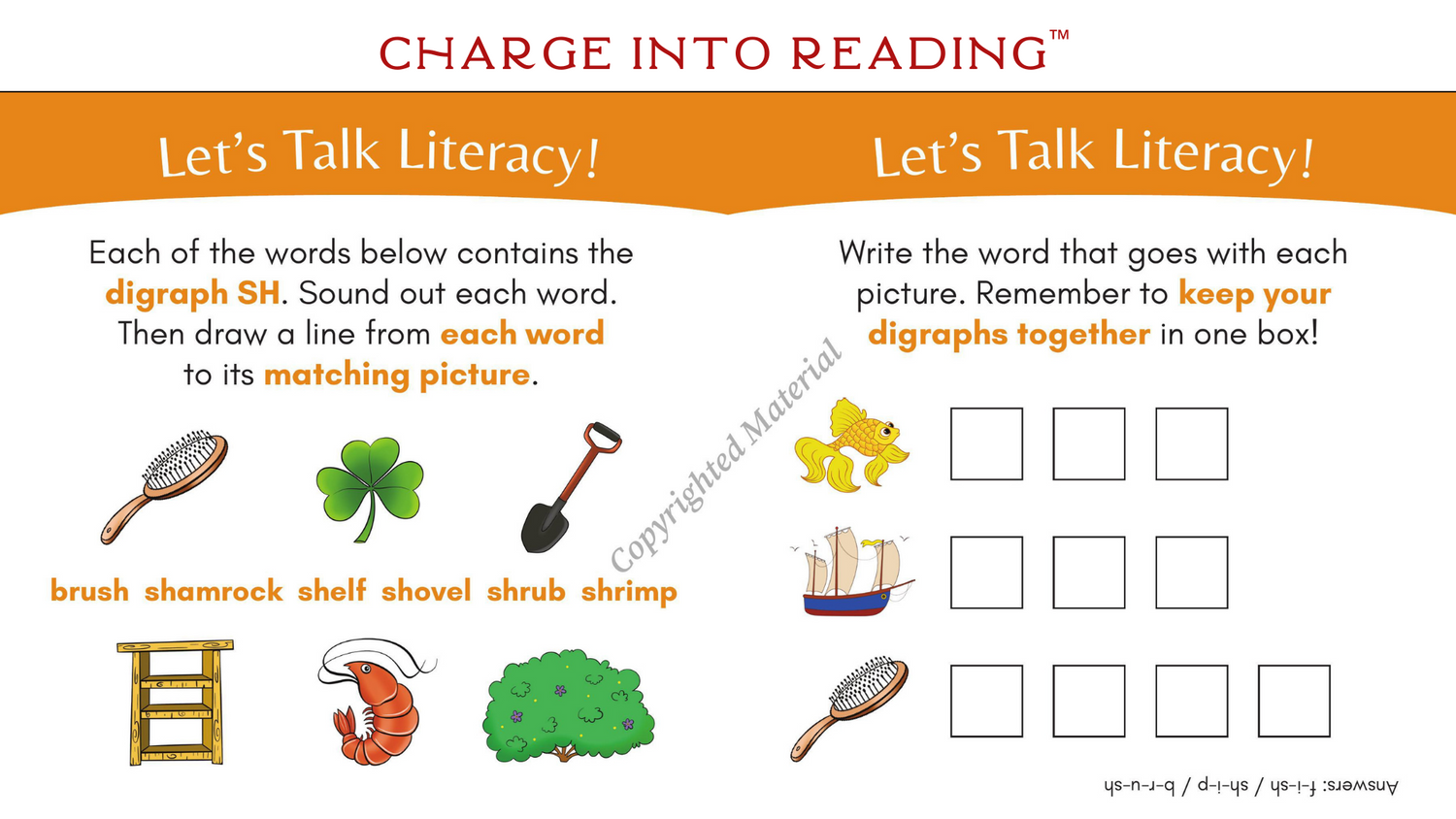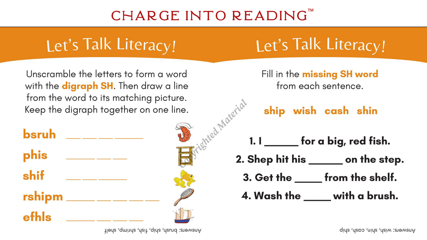 SH words in this story: brush, Dash, fish, flash, gosh, hush, Josh, rush, shack, shad, shins, ship, shock, shrugs, shucks, splash, swish, wishHigh-frequency words in this story: for, he