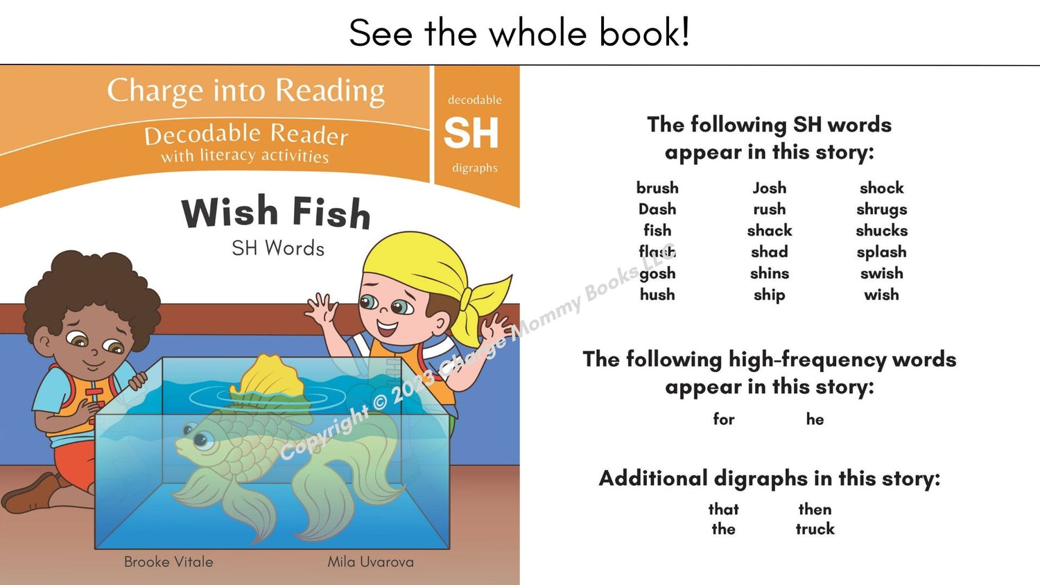 Wish Fish focuses on the digraph SH, introducing 18 new SH words: 7 initial SH words and 11 ending SH words.