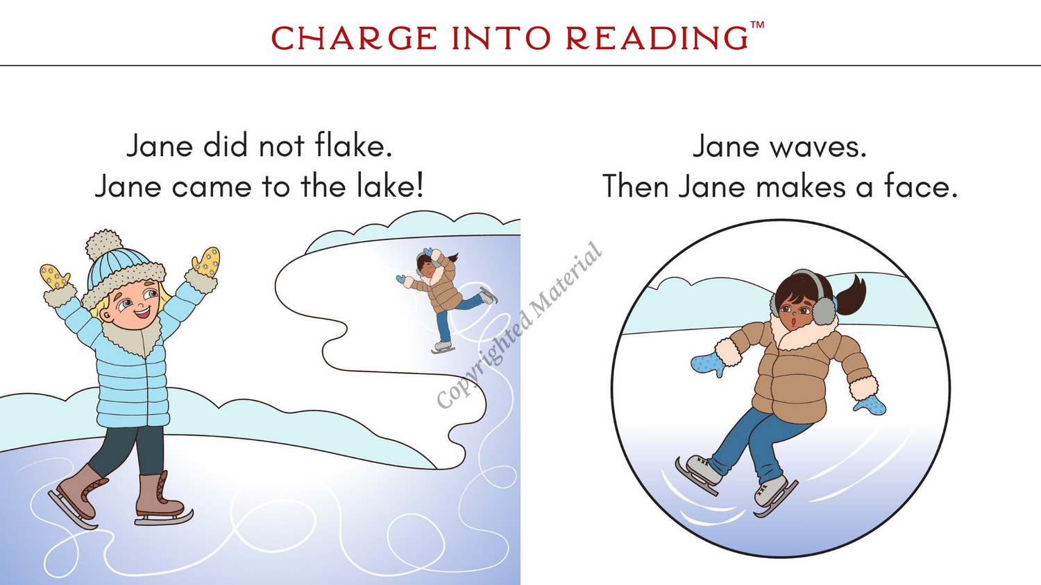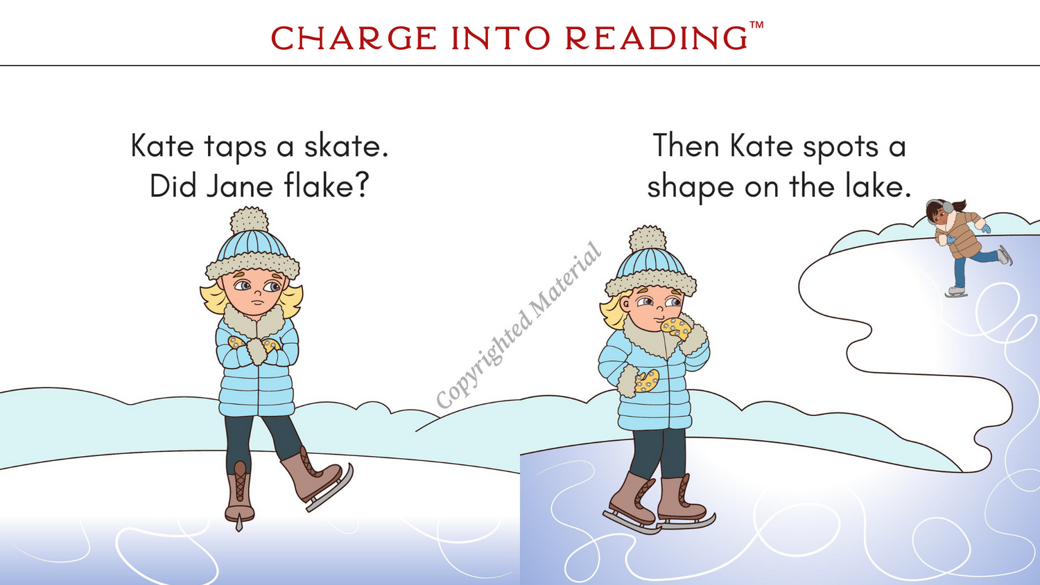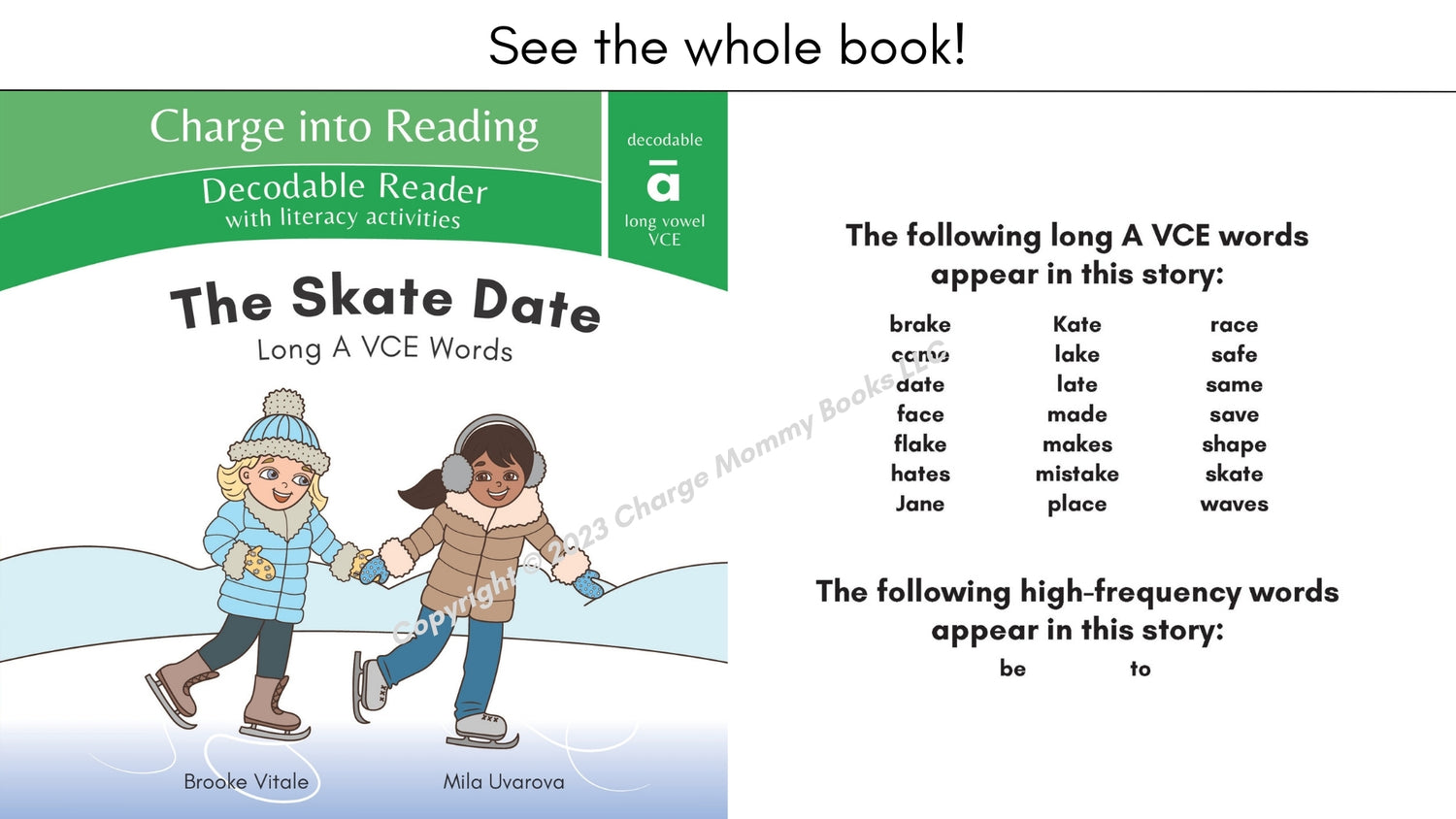 Long A VCE words in this story: brake, came, date, face, flake, hates, Jane, Kate, lake, late, made, makes, mistake, place, race, safe, same, save, shape, skate, wavesHigh-frequency words in this story: be, to